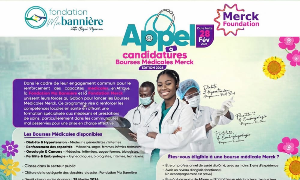 La Fondation Ma Bannière, présidée par la Première Dame du Gabon, Zita Oligui Nguema, en partenariat avec la Merck Foundation, lance l’appel à candidatures de l’édition 2026 des Bourses Médicales Merck, un programme stratégique de formation qui vise à renforcer les compétences spécialisées des professionnels de santé gabonais.